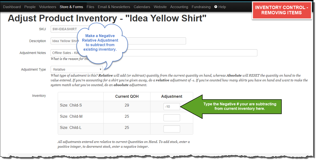 You have 29 small shirts remaining and you sell 10 for cash purchases at the school's Kindergarten Registration event. The adjustment will be -10 (negative 10) which will give you a total of 19 shirts available to sell. Type "-10" in as the Relative Adjustment and the system will automatically subtract the items from your inventory.