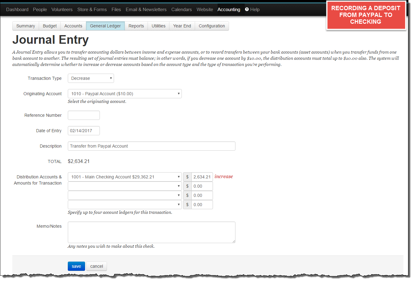 When you transfer money from your PayPal Account into your Checking Account, you will need to record the transaction in your Membership Toolkit Accounting.