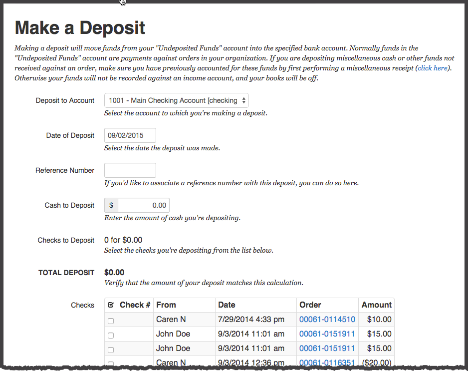 If there is an order in your Membership Toolkit account with a balance due and you receive cash or check as payment, you need to edit the order and record the payment. Until the payment is recorded, the cash or check is entered into your Undeposited Funds account.